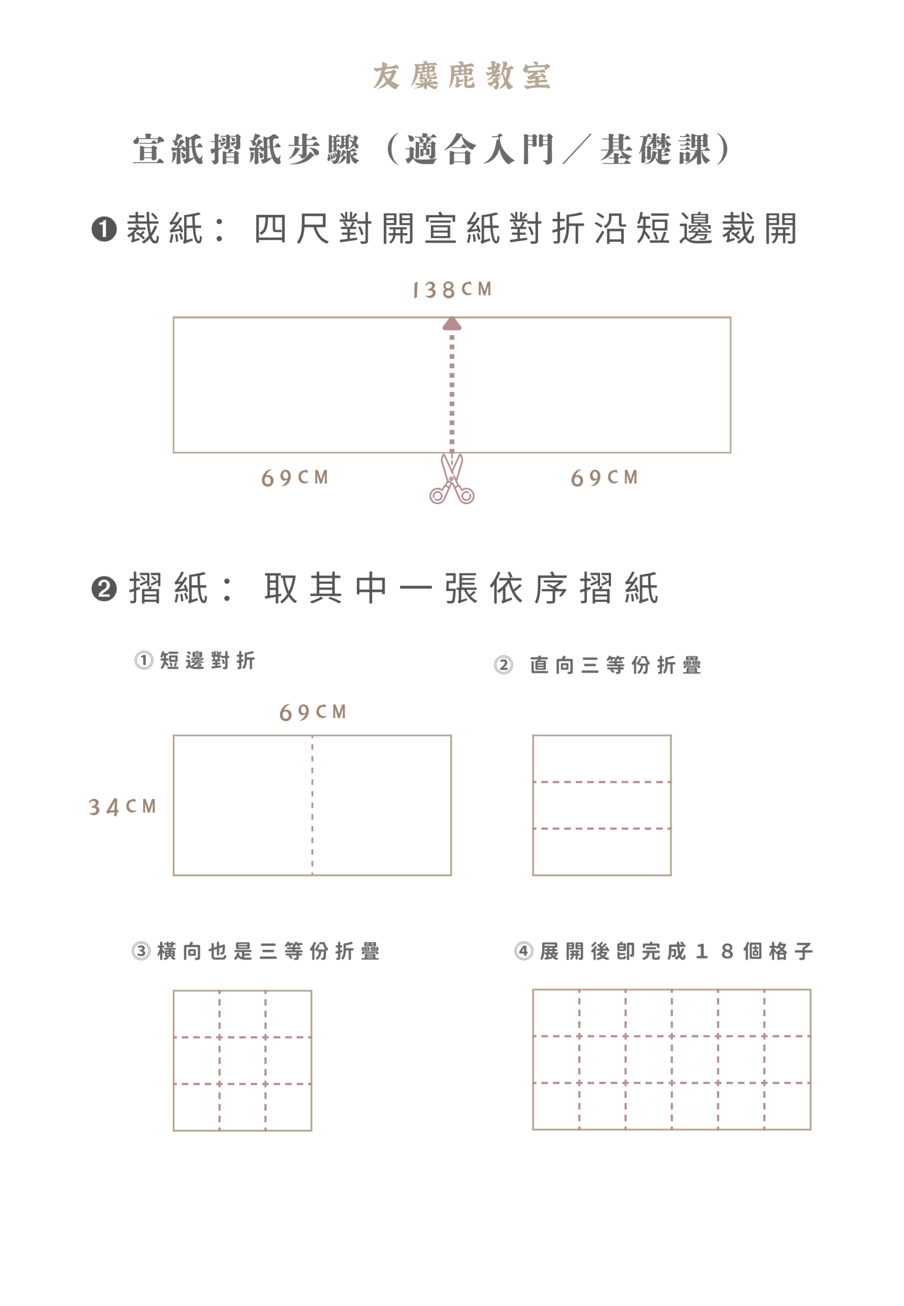 如果你使用空白宣紙,可以使用這個方法簡單疊出需要的格子:〔宣紙摺疊步驟〕。